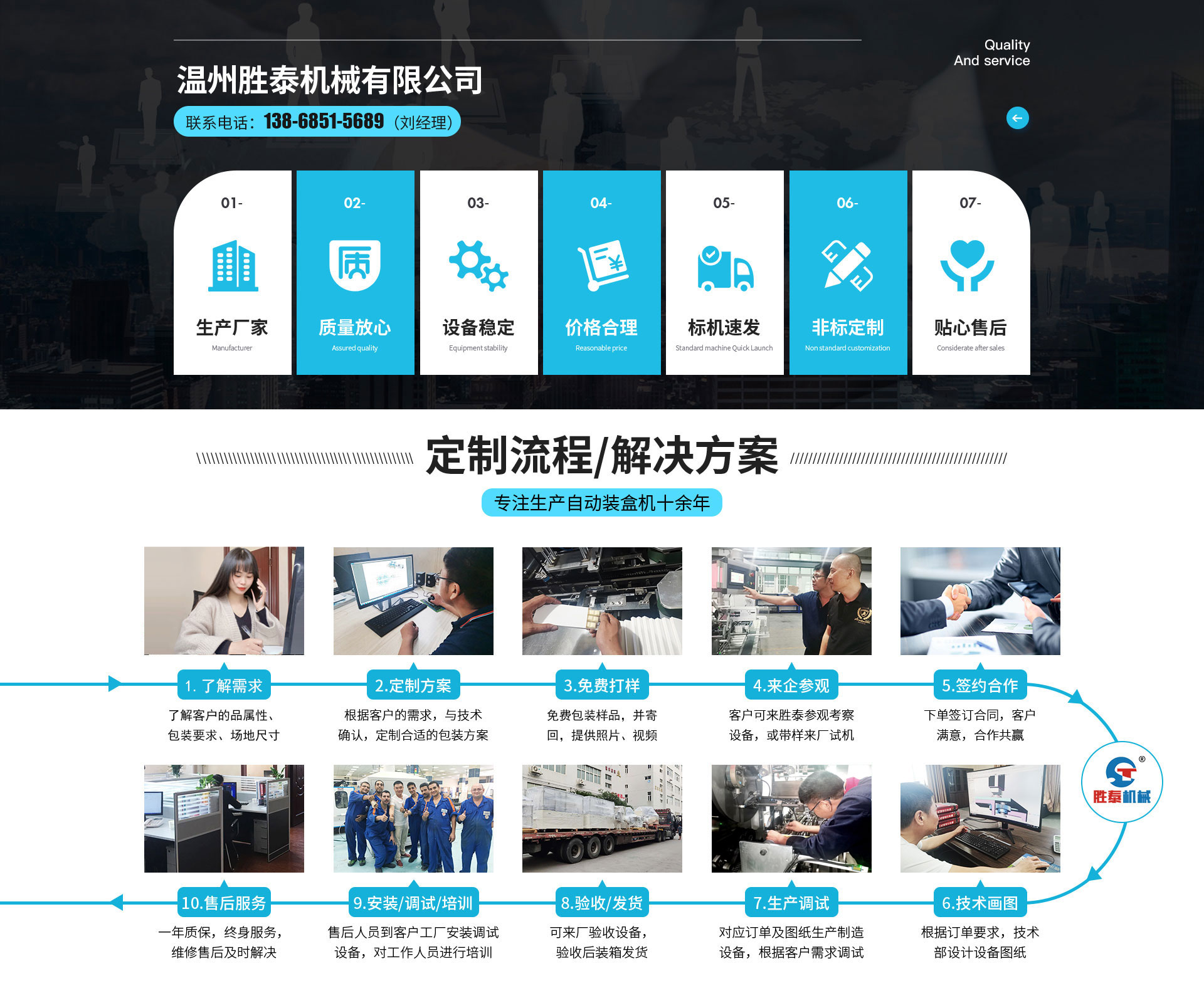 溫州勝泰機(jī)械有限公司位于東海之濱, 坐落于"包裝機(jī)械城"-溫州市。集研發(fā)、生產(chǎn)、經(jīng)貿(mào)于一體的現(xiàn)代化科技型企業(yè),是國(guó)家高新技術(shù)企業(yè),通過(guò)了CE認(rèn)證、IS09001質(zhì)量體系認(rèn)證,并獲得了多項(xiàng)專(zhuān)利。從事盒裝紙包裝設(shè)備10余年,具有先進(jìn)的技術(shù)力量和生產(chǎn)工藝,制造經(jīng)驗(yàn)豐富、產(chǎn)品質(zhì)量可靠、價(jià)格合理、能為廣大客戶(hù)提供設(shè)備、技術(shù)、原材料供應(yīng)全方位服務(wù),幫助客戶(hù)打造專(zhuān)業(yè)化、智能化、無(wú)人化的工業(yè)4.0工廠。